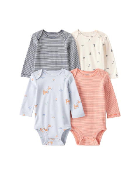 Pack de cuatro bodies de manga larga confeccionados en suave algodón. Con hombros superpuestos y broches inferiores para vestir y cambiar al bebé fácilmente. Cómodos, prácticos y perfectos para usar todos los días.